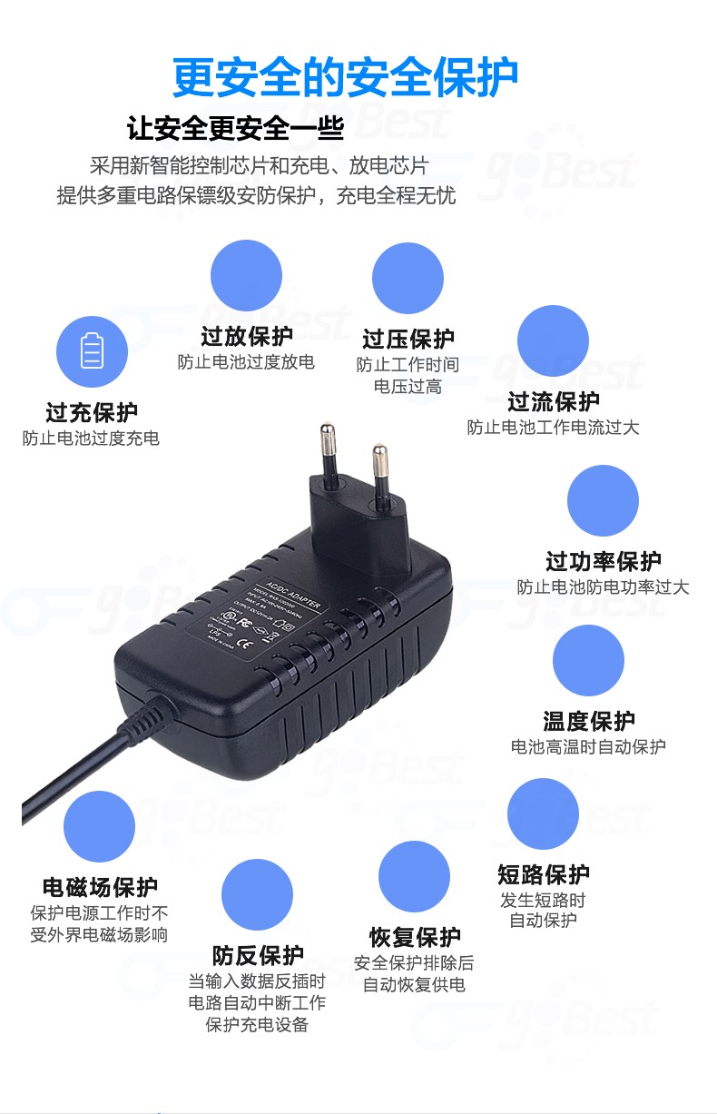 • 采用前沿IC控制方案和先进的制造工艺,高精度,低噪音;过压,过流,过充,短路等多重保护。